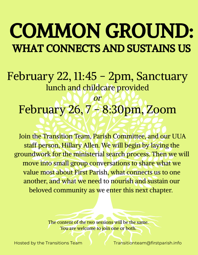 Join the Transition Team, Parish Committee, and our UUA staff person, Hillary Allen. We will begin by laying the groundwork for the ministerial search process. Then we will move into small group conversations to share what we value most about First Parish, what connects us to one another, and what we need to nourish and sustain our beloved community as we enter this next chapter. Hosted by the Transitions Team – Transitionteam@firstparish.info.