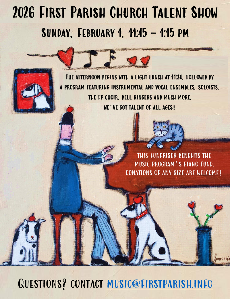 This fundraiser benefits the Music Program’s piano fund and begins with a light lunch and a program featuring the FP Choir, Bell Ringers, instrumental/vocal soloists and ensembles of all ages. We can still use volunteers (musicians or helping hands.) Contact music@firstparish.info or see Robin Baker, Bob Rowlands or Music Director Daniel Parsley. Donations of any size will be appreciated.