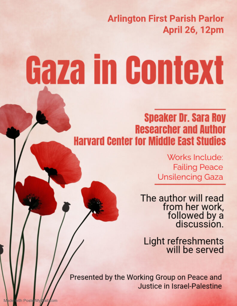 The Working Group on Peace and Justice in Israel-Palestine is hosting Dr. Sara Roy, a researcher at Harvard’s Center for Middle Eastern Studies, to speak about Gaza. Dr. Roy began her research in the Gaza Strip and West Bank in 1985 with a focus on the economic, social and political development of the Gaza Strip and on US foreign assistance to the region. She is the author of Failing Peace and Unsilencing Gaza. Dr. Roy will reflect on Gaza today, drawing from her extensive body of work and followed by a discussion.