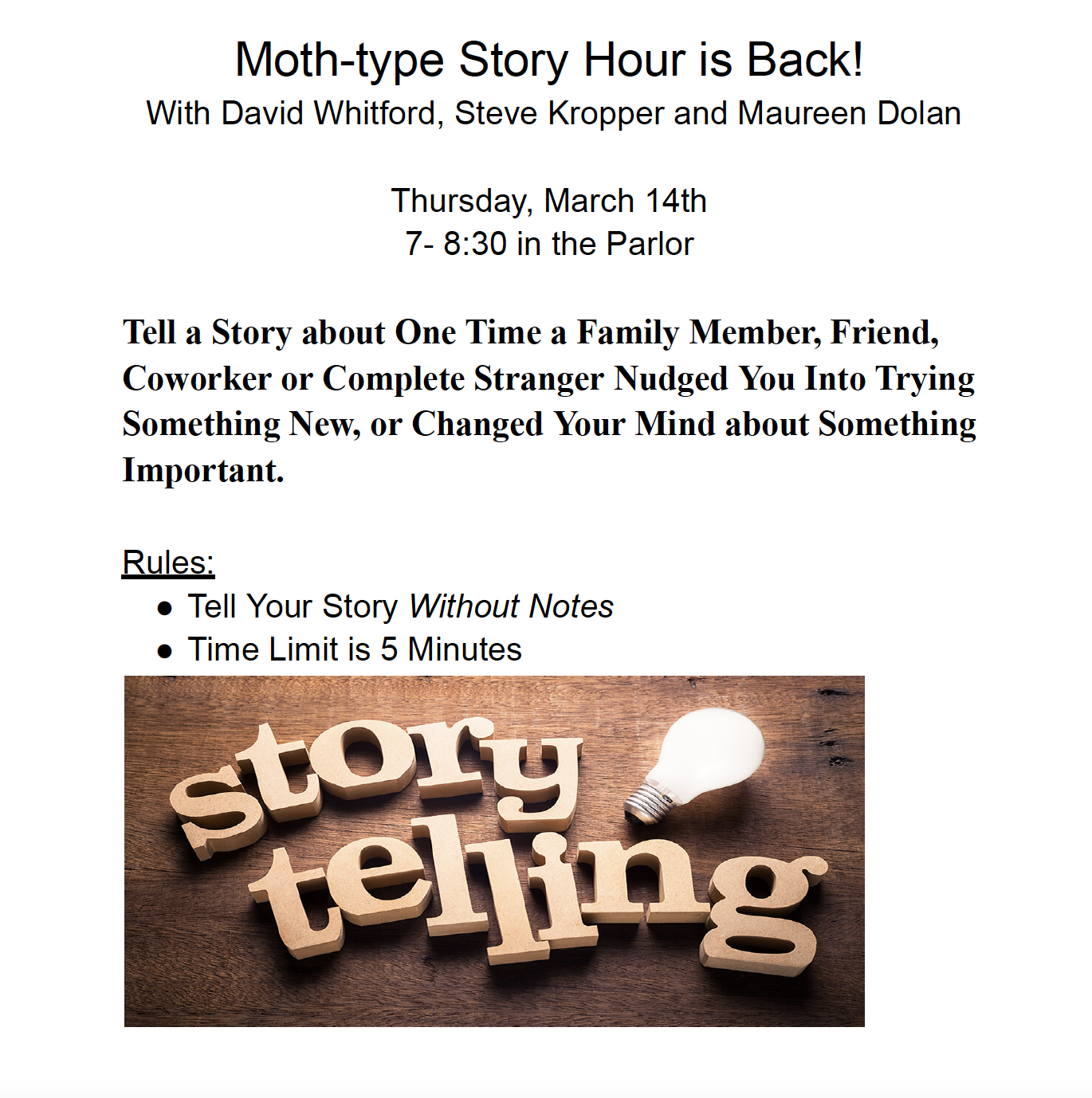 David Whitford and Steve Kropper will moderate this event, where participants will tell a story about one time a family member, friend, coworker or complete stranger nudged them into trying something new, or changed their mind about something important.