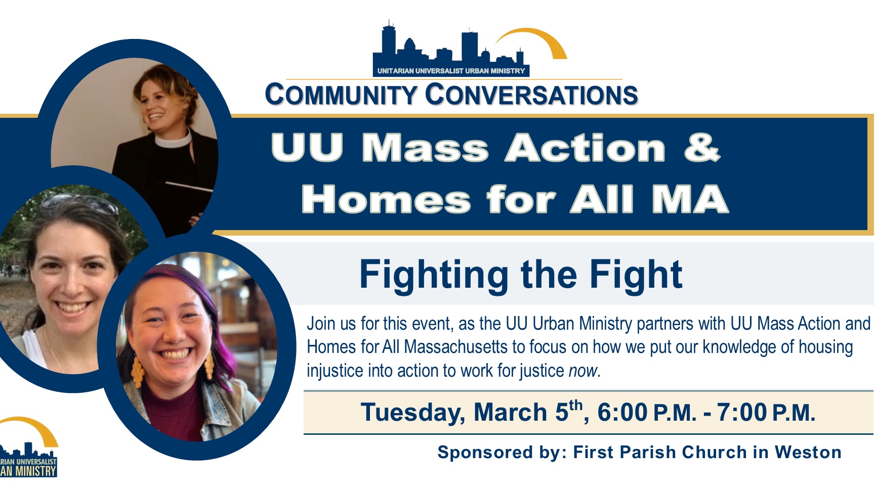 Hear what we can do now—and together—to confront housing issues facing Black and Brown people in communities like Roxbury. UU Mass Action and Homes for All Massachusetts representatives will discuss the urgency of fighting housing injustice in this segment of the UU Urban Ministry Community Conversation series on gentrification. Visit https://www.uuum.org/ for more information.
