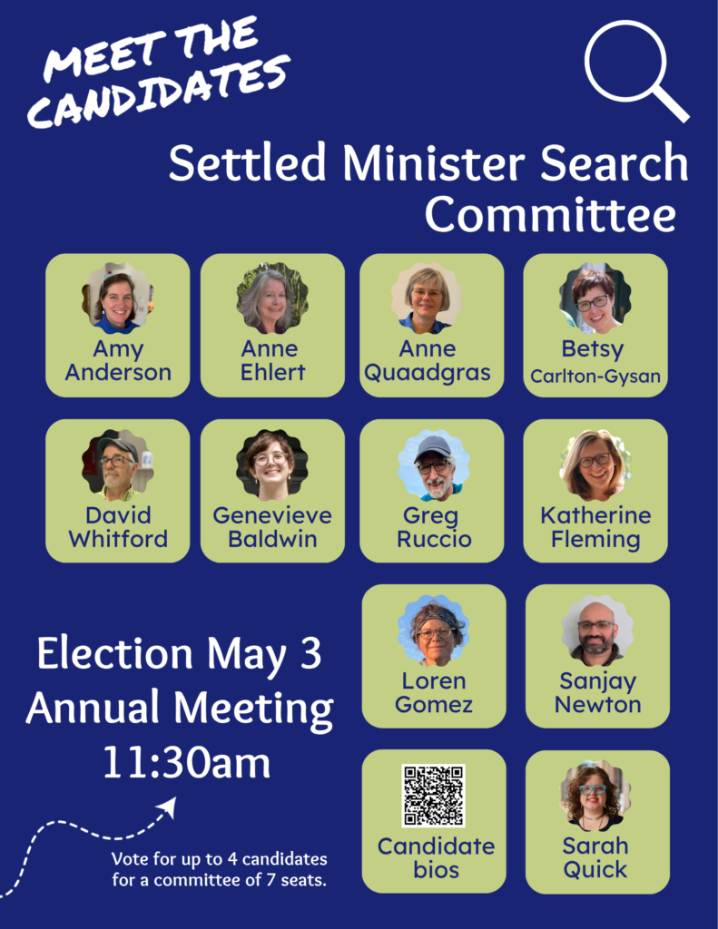 Get to know the Candidates in person at a candidate meet-and-greet during coffee hour on Sunday, April 26th. In the meantime, please take a moment to get to know them through their biographical statements. On that page, you can also read an FAQ about the process used to select these candidates.