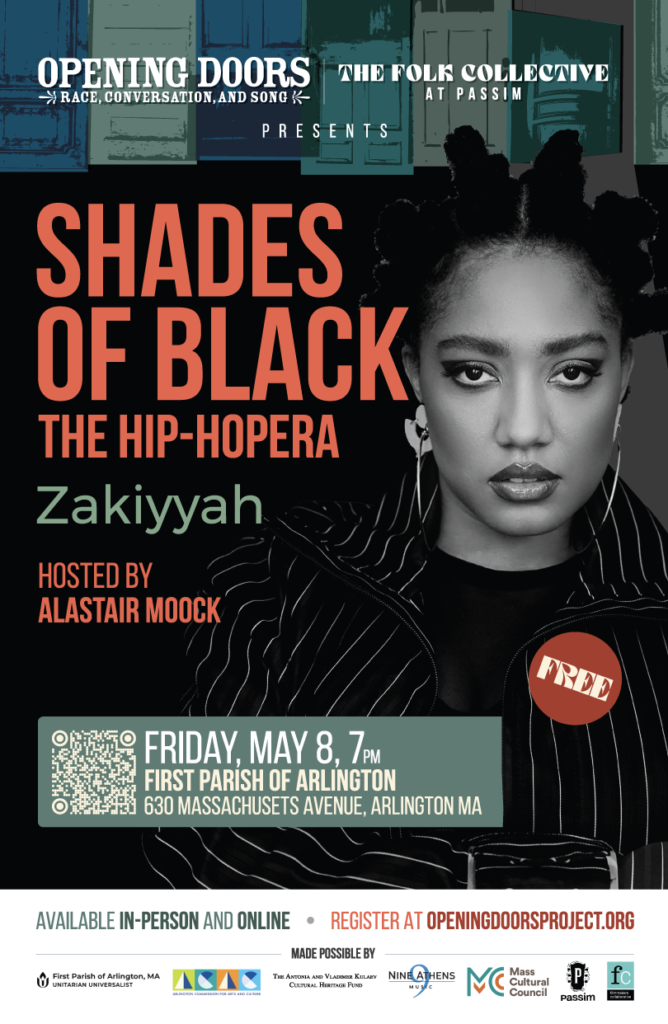 In collaboration with the Club Passim Folk Collective, Opening Doors presents “Shades of Black: The Hip-Hopera,” a free concert and conversation with Zakiyyah at Arlington UU Church.
