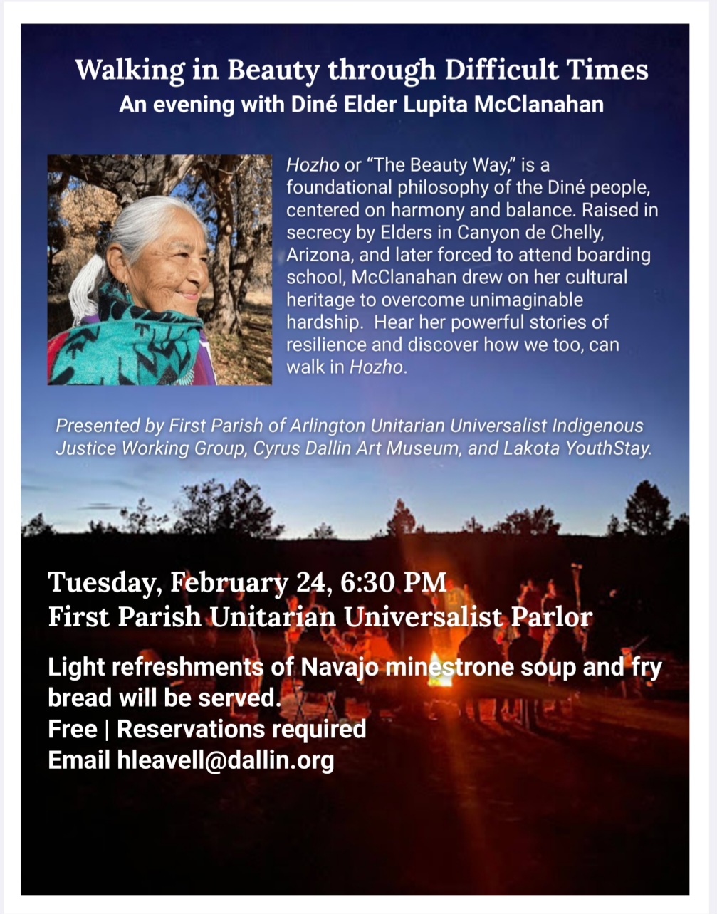 “Hozho” or “The Beauty Way” is a core practice of the Diné people. Raised in secrecy by traditional elders in Canyn de Chelly, Lupita was hidden to preserve her family’s lineage from the boarding school system. Though eventually taken, she drew on her cultural strength to endure and overcome unimaginable challenges. Join us to hear her powerful stories of resilience and discover how we, too, can walk in Hozho. Presented by the FP Indigenous Justice Working Group (IJWG), Cyrus Dallin Art Museum, and Lakota YouthStay. Light refreshments of Navajo minestrone soup and fry bread will be served. Free. Reservations required. Email hleavell@dallin.org.