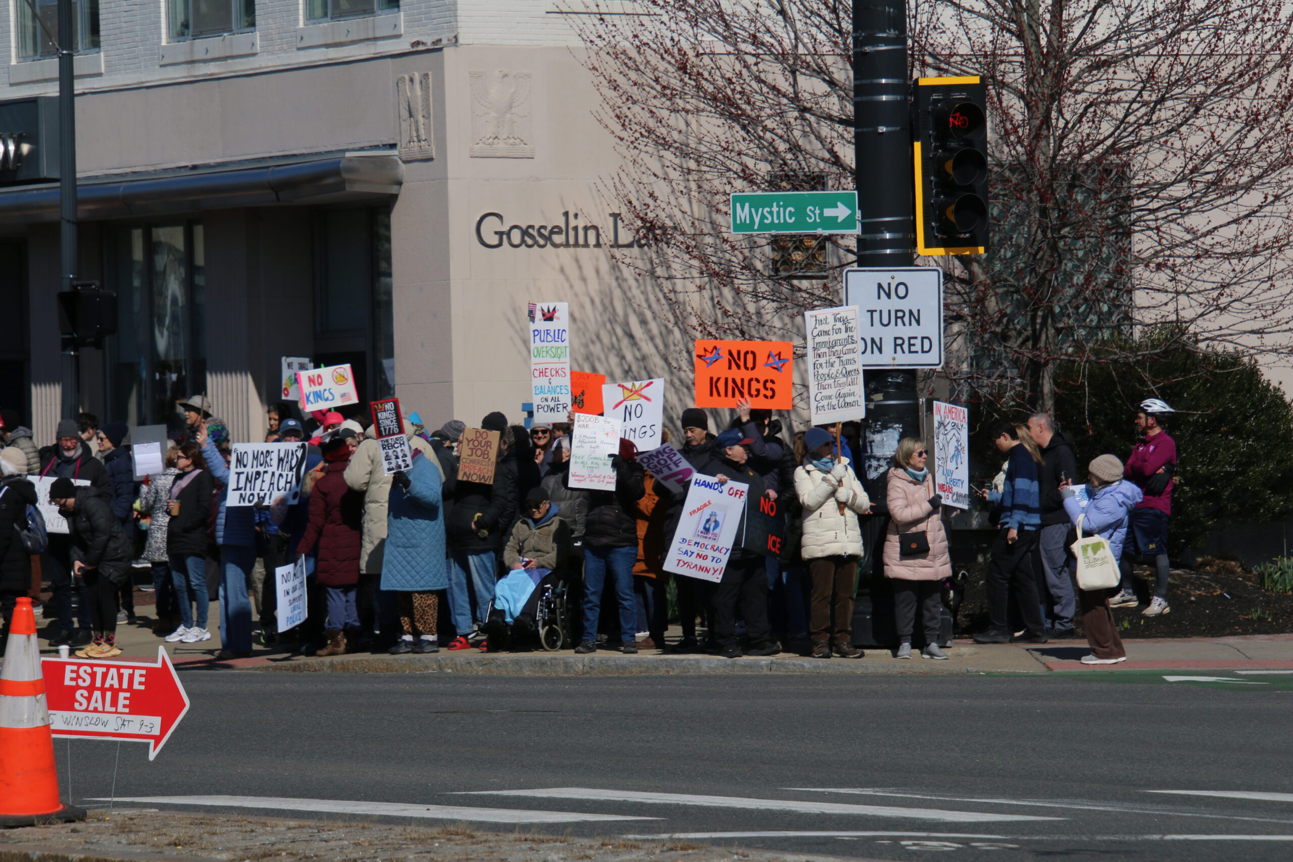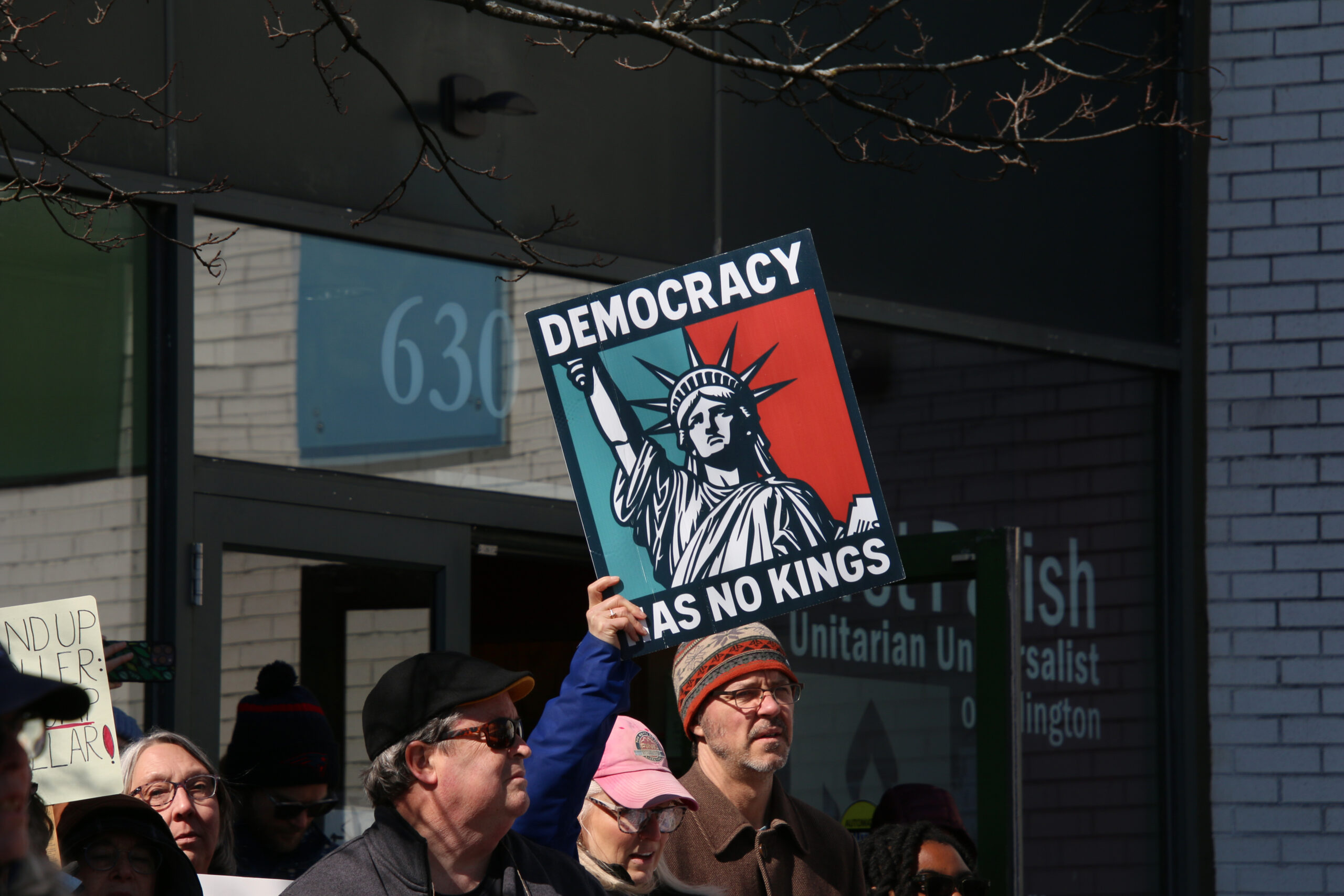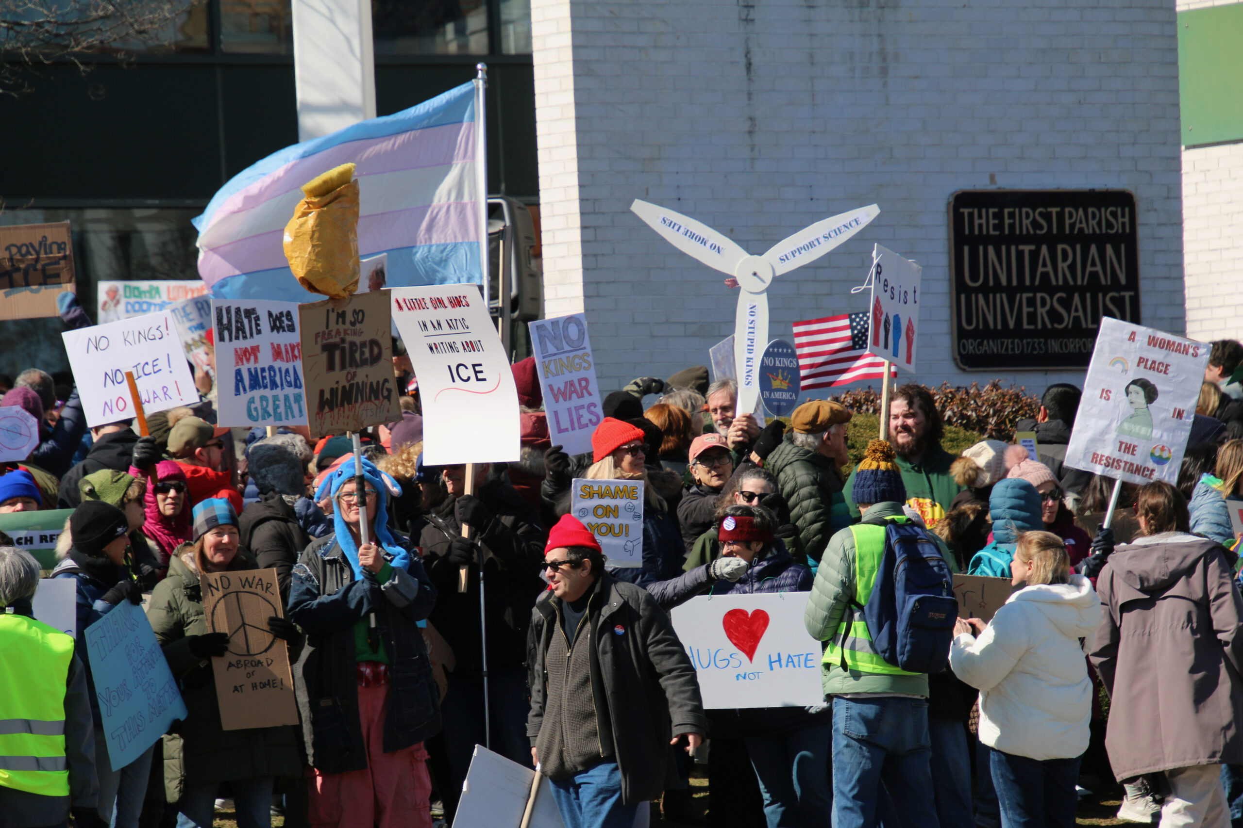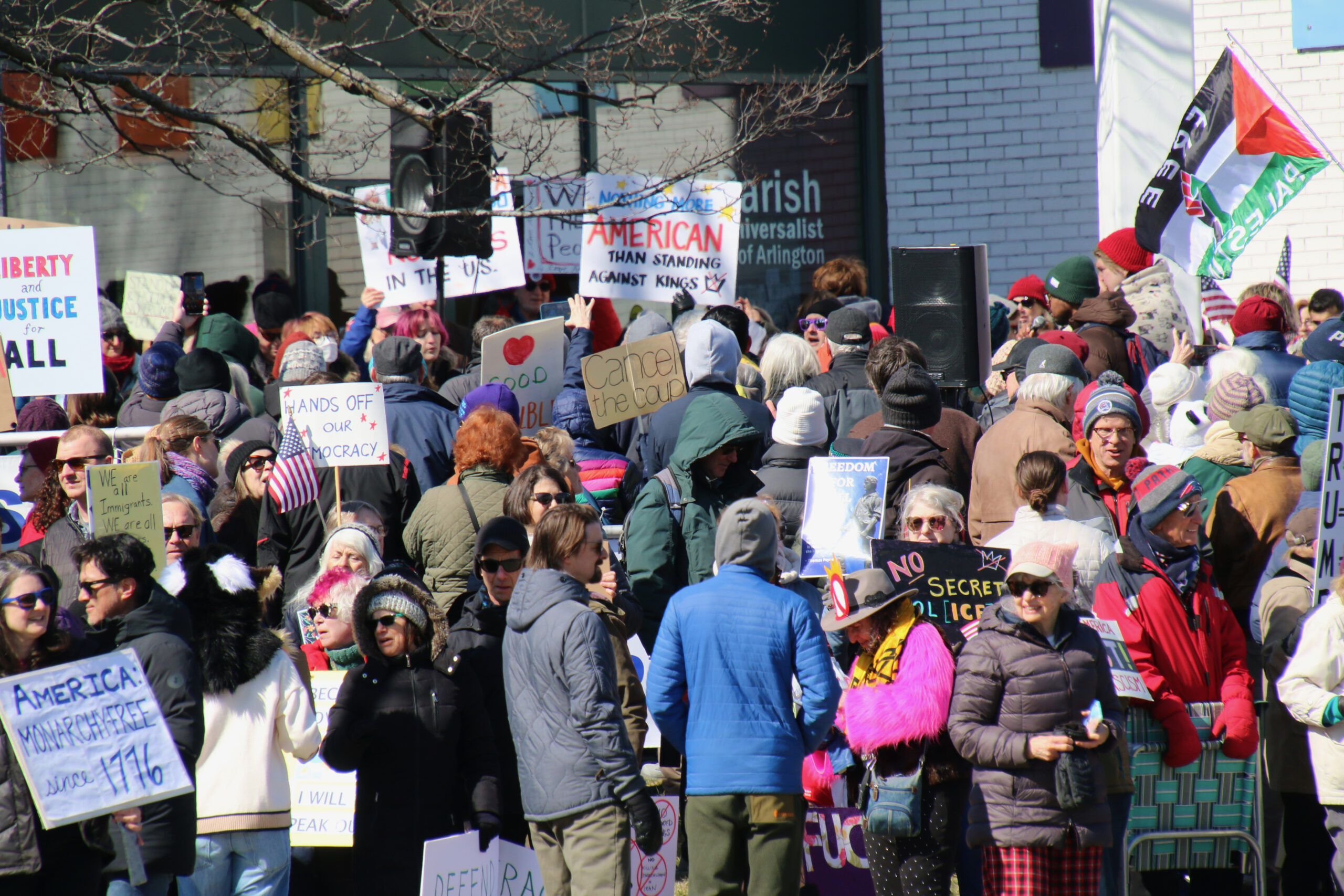 Thousands came out to the First Parish lawn this Saturday morning, March 28, for a No Kings Rally to stand up for our communities and reject the increasing authoritarian excesses and corruption of the Trump administration. According to reporting from YourArlington, an estimated 3000 people gathered peacefully on the First Parish lawn at 10:00am on Saturday morning, with no arrests or distracted driving car accidents. First Parish, led by the FP Defending Democracy Working Group, and Indivisible L.A.B. (Lexington, Arlington, Belmont) co-sponsored the rally, one of thousands of similar events across the country on Saturday. This No Kings Day of Action was the third of such national calls to gather peacefully in protest since the start of President Trump’s second term in January 2025. The rally at First Parish, along with similar gatherings sponsored by Indivisible LAB in Lexington and Bedford, were scheduled in the morning to allow for participants to attend the Boston No Kings event later in the day.