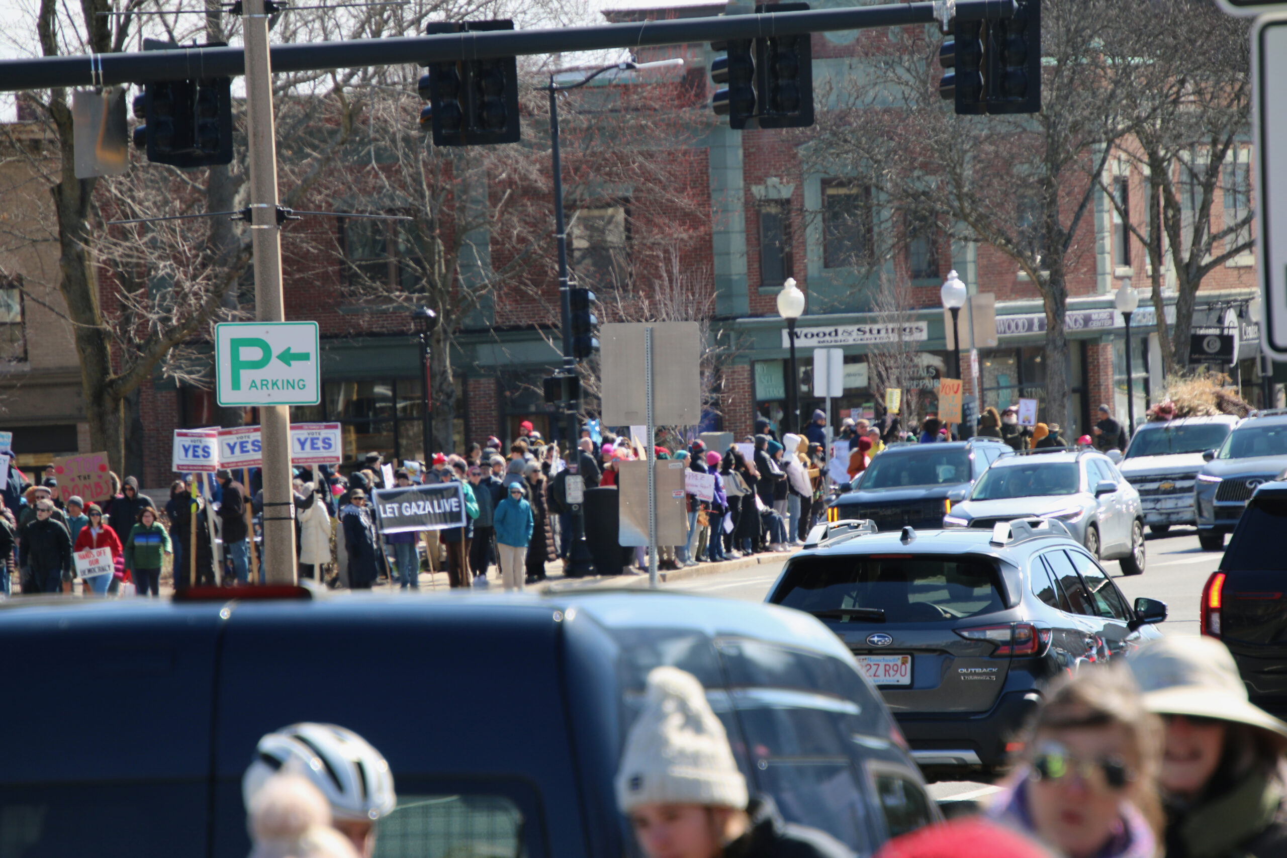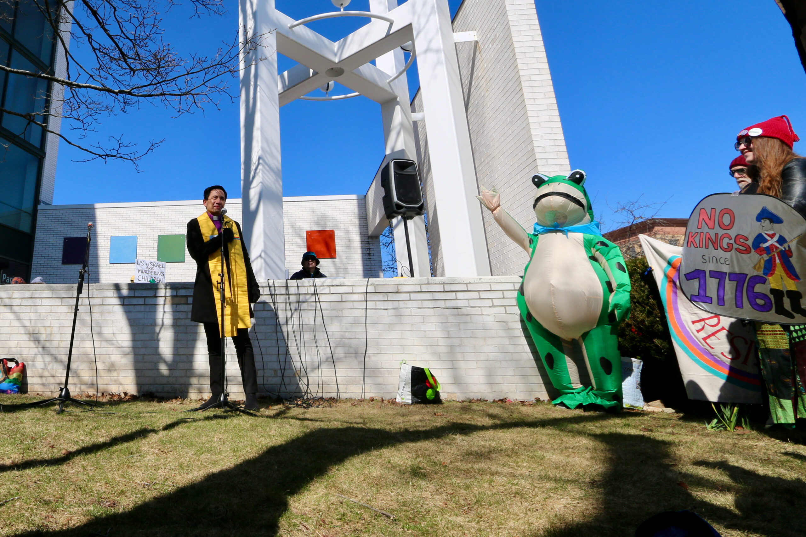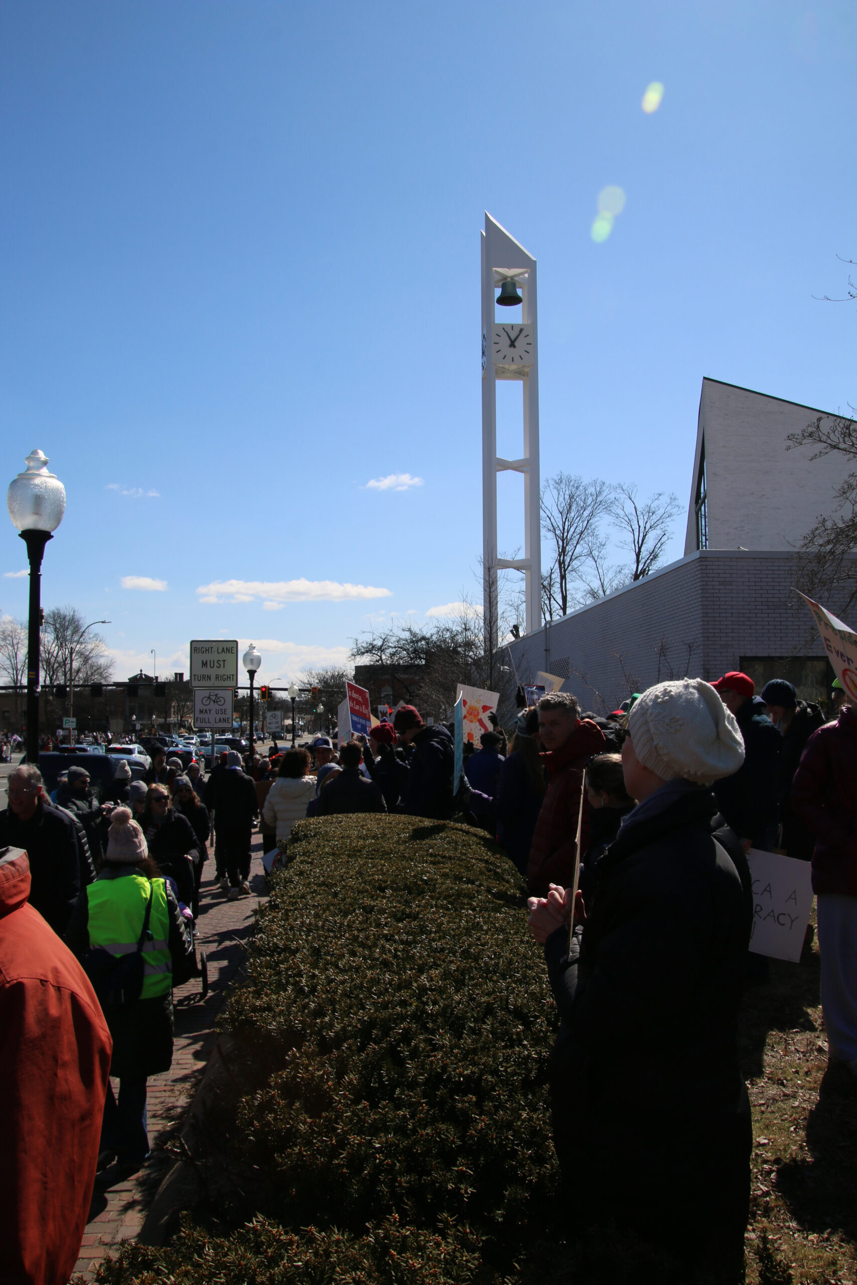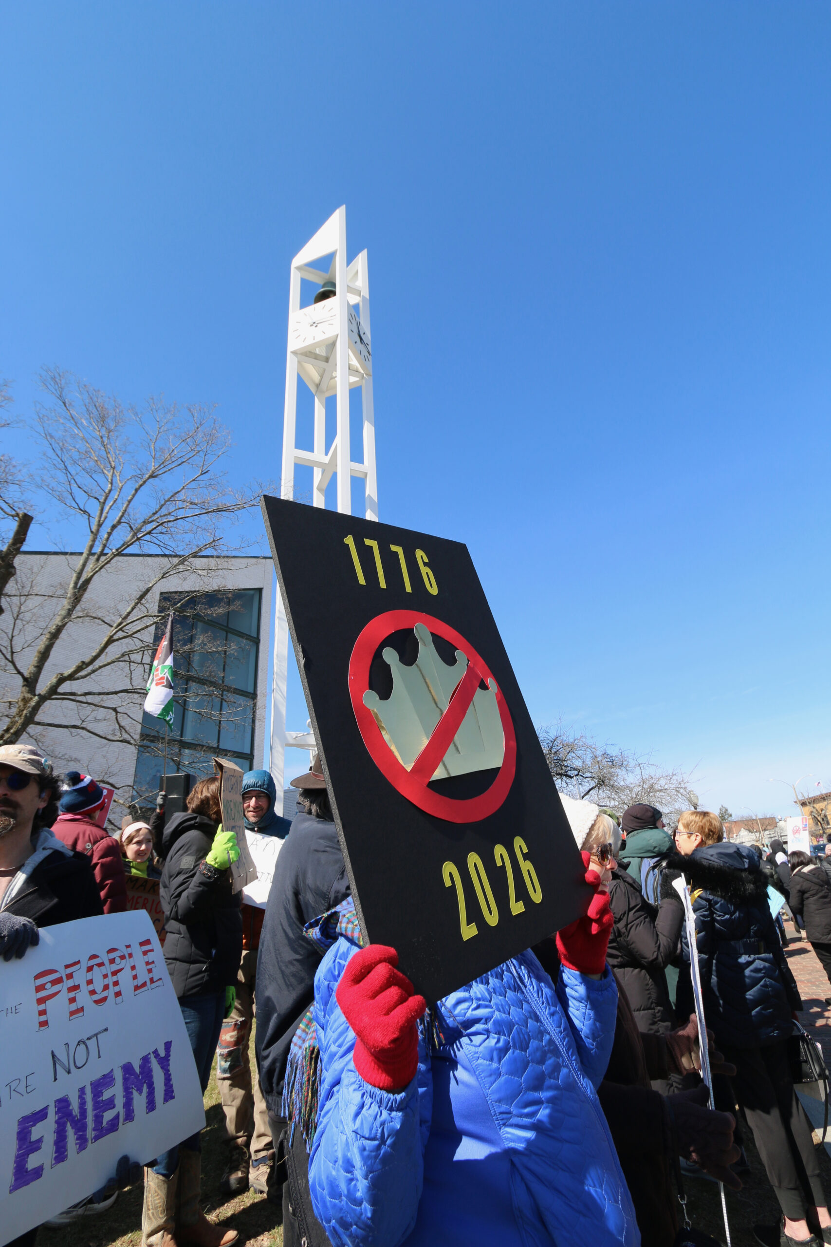 Thousands came out to the First Parish lawn this Saturday morning, March 28, for a No Kings Rally to stand up for our communities and reject the increasing authoritarian excesses and corruption of the Trump administration. According to reporting from YourArlington, an estimated 3000 people gathered peacefully on the First Parish lawn at 10:00am on Saturday morning, with no arrests or distracted driving car accidents. First Parish, led by the FP Defending Democracy Working Group, and Indivisible L.A.B. (Lexington, Arlington, Belmont) co-sponsored the rally, one of thousands of similar events across the country on Saturday. This No Kings Day of Action was the third of such national calls to gather peacefully in protest since the start of President Trump’s second term in January 2025. The rally at First Parish, along with similar gatherings sponsored by Indivisible LAB in Lexington and Bedford, were scheduled in the morning to allow for participants to attend the Boston No Kings event later in the day.